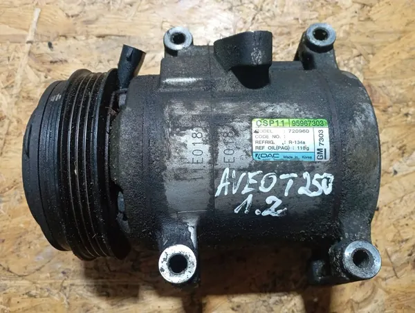 Compressore aria condizionata per Chevrolet Aveo T250 1.2. Il compressore è funzionante e sigillato. Questa è una parte usata e verrà emessa una fattura IVA. La qualità è originale con il logo del produttore (OEM). Compatibile con veicoli privati. Il numero di parte OEM è 95967303, con numeri alternativi che includono R134A e il numero originale 720960. Questa è la versione europea.
