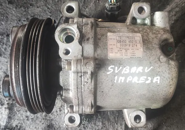 Compressore aria condizionata usato per Subaru Impreza II 1.6, 95CV (70kW), prodotto tra il 2000 e il 2005. Numero di parte OEM: 73111FE000. La parte è in condizioni usate e viene fornita con fattura IVA. È un pezzo originale con il logo del produttore del veicolo (OE). L'imballaggio è di ricambio.