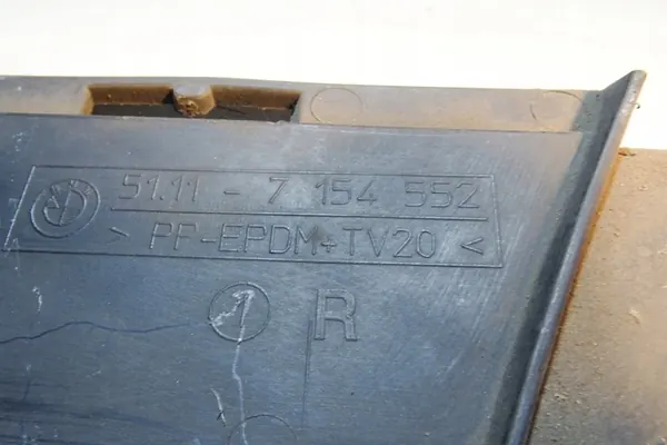 Griglia paraurti destra usata per BMW 3 Series (E90), adatta per motori diesel da 2.0L con 120kW, prodotta nel 2005. Questo pezzo è un componente di ricambio originale (OEM), contrassegnato con il logo del produttore. Il numero di parte è 51117154552. È progettato per automobili e si trova nella parte anteriore del veicolo.
