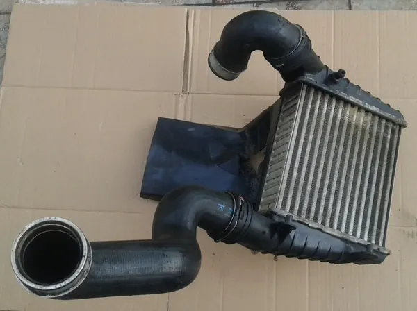 Intercooler / radiatore dell'aria e tubi per Volkswagen / VW Passat B5 1.9 TDI, anni di modello 1996-2005, numero di parte 3B0145805D e altri mostrati nelle foto. Versione europea, condizione come mostrato nella foto con segni normali di utilizzo, tutto è a posto. Altri pezzi per questo modello sono disponibili anche nelle mie inserzioni.