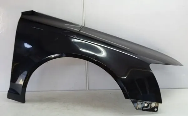Parafango anteriore destro per Audi A6 C6 2008-2011, pezzo originale in alluminio. Le condizioni sono visibili nelle foto, mostrando buone condizioni con lievi piegature in due punti. I montaggi completi sono inclusi e non ci sono corrosioni. Il colore è nero metallizzato.