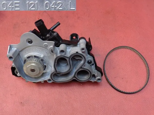 Pompa acqua con cinghia per VW Golf VII, Seat Leon, Skoda Octavia 1.4 TSI. Numeri di catalogo della pompa: 04E121042L, 04E109111AH, 04E121600AH. Numero di catalogo della cinghia: 04E121605F. Dal motore CHP, anno 2016.