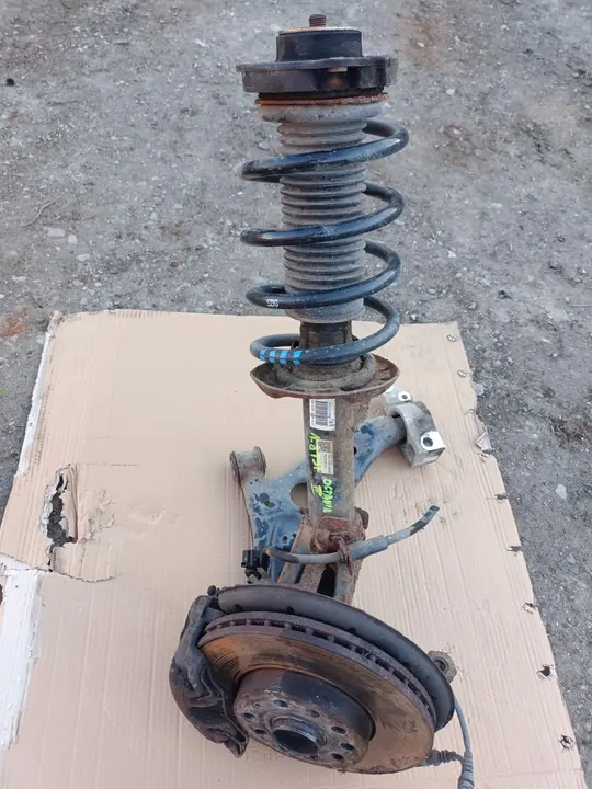 Snodo di sospensione anteriore sinistro per Skoda Octavia II Lift 1.8 TFSI. Numero di parte: 1T0413031JD. Condizione: Usato, con un filetto danneggiato nel montaggio superiore. A causa del peso, il trasporto non include il pinza freno e il disco.