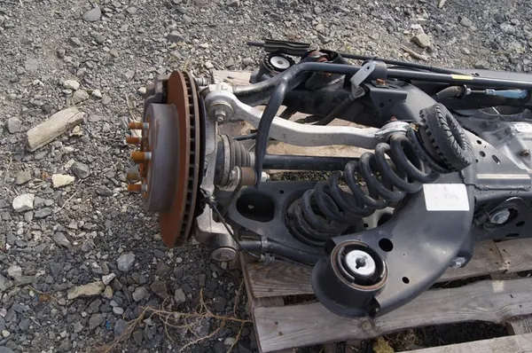 Il lato della sospensione posteriore sinistra include snodo, mozzo, pinza, semialbero e molla. Non è incluso l'amortizzatore.
